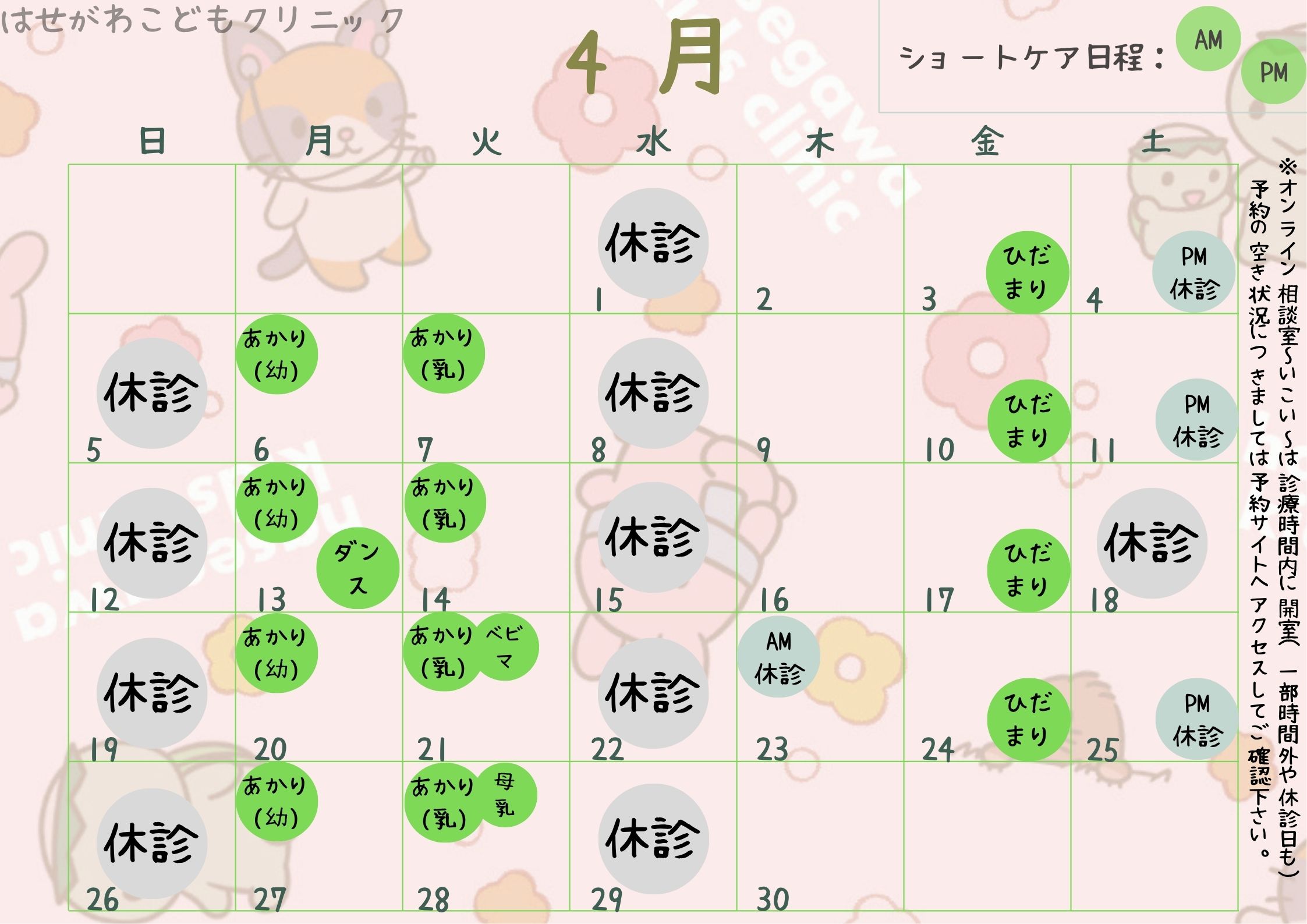 はせがわこどもクリニックの2026年4月のプログラムのスケジュールのお知らせをさせていただきます。